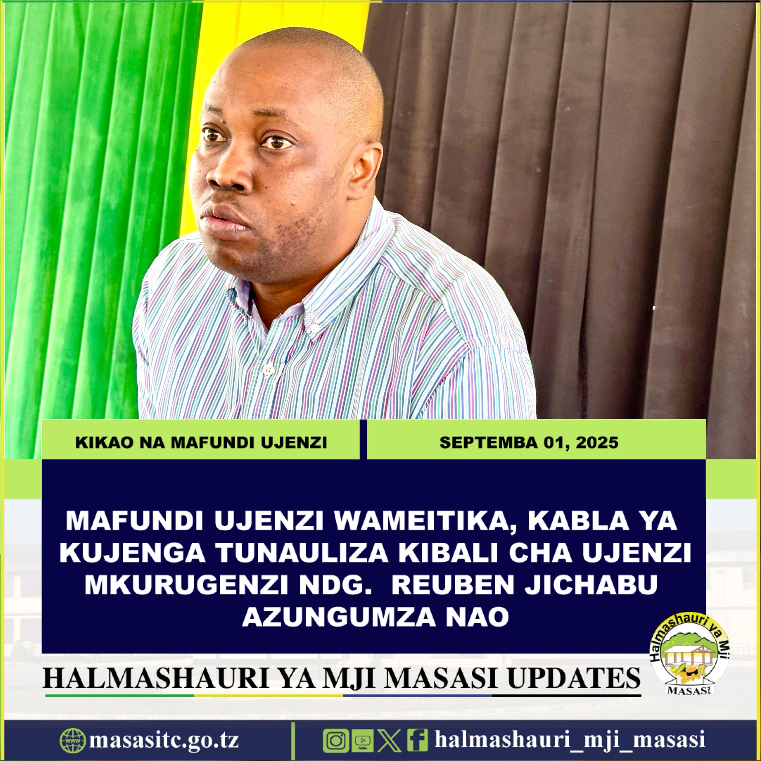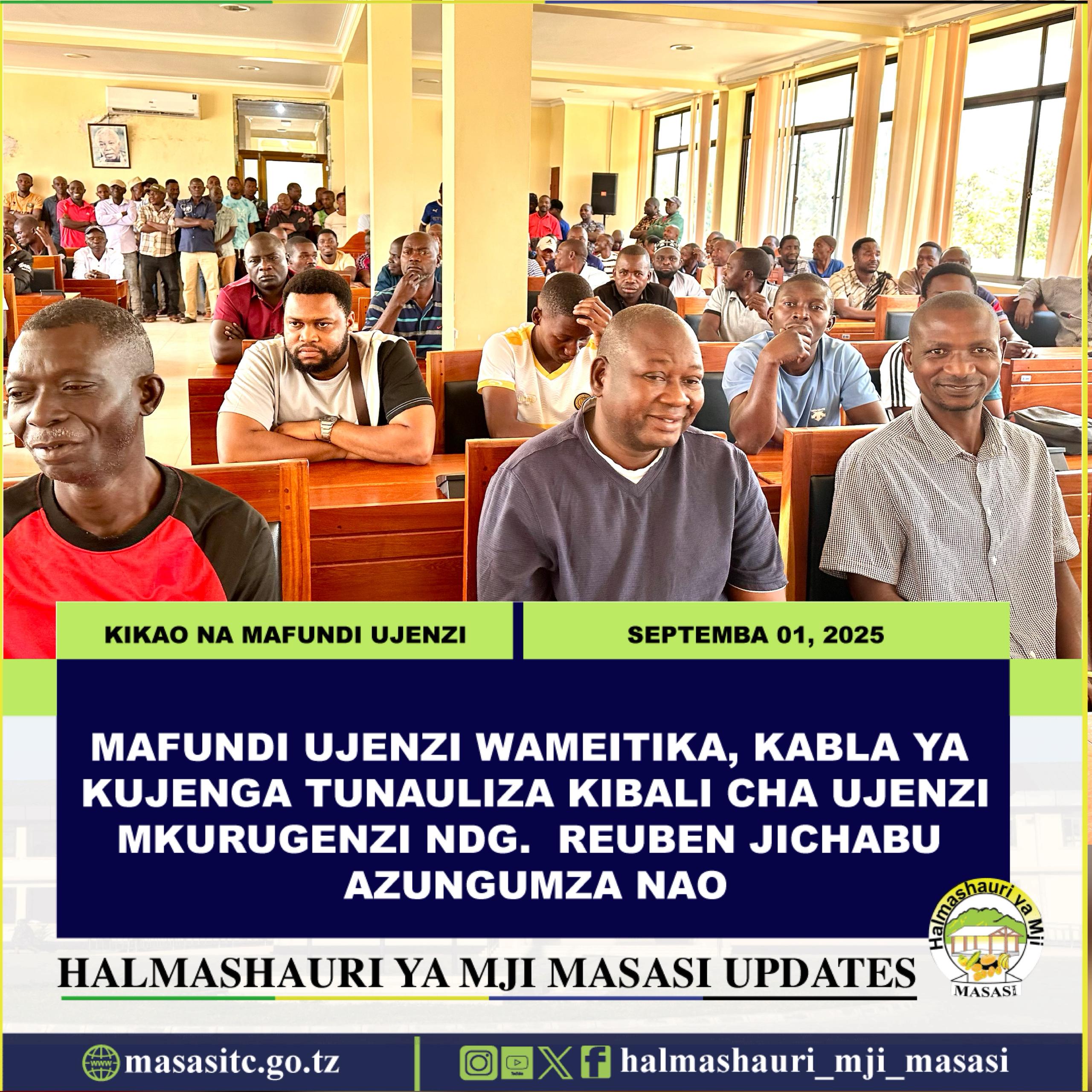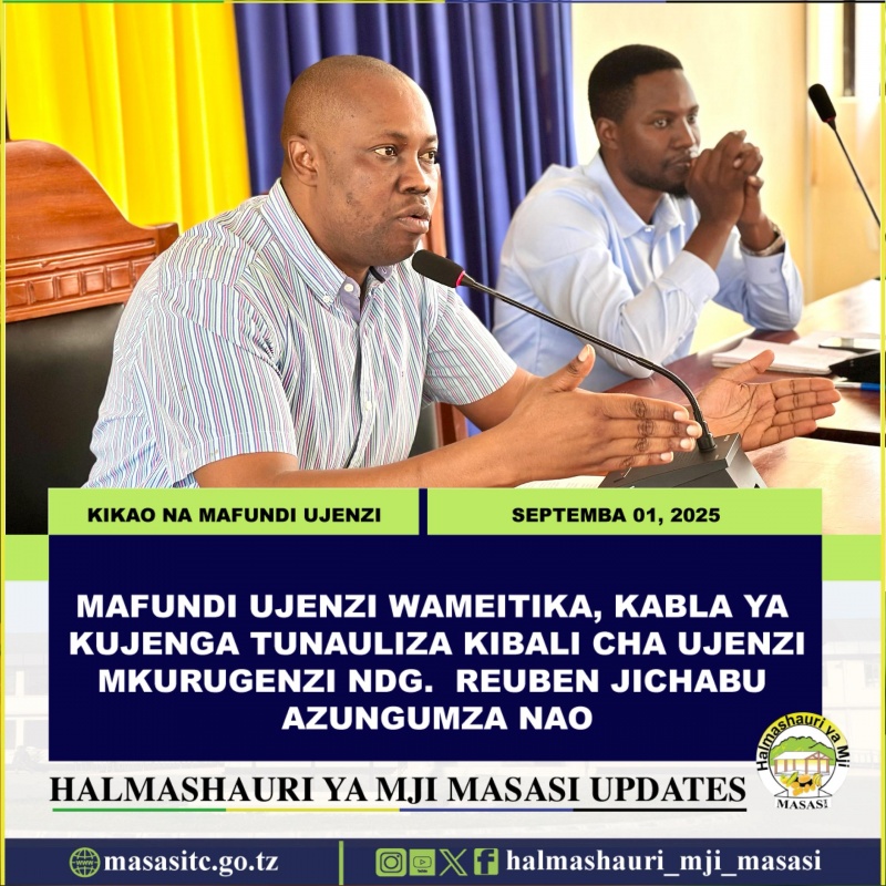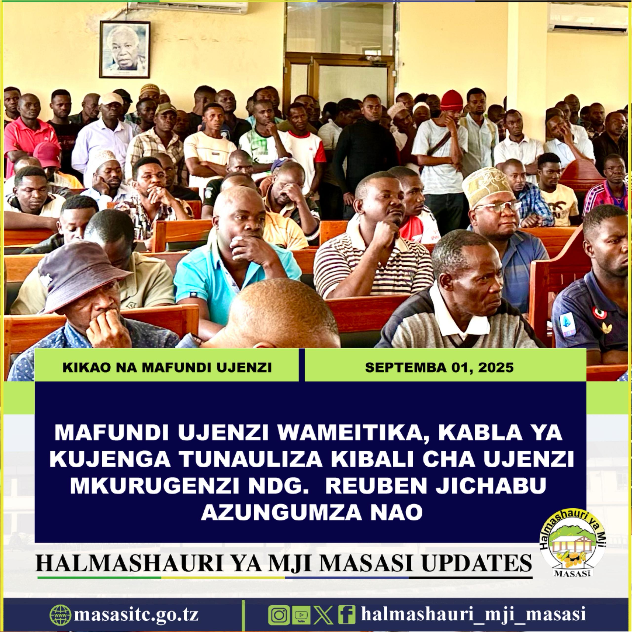 Mkurugenzi wa Halmashauri ya Mji Masasi Ndg. Reuben Sixbert Jichabu leo Septemba 01, 2025 amekutana na kuzungumza na mafundi ujenzi wote wa Halmashauri ya Mji Masasi kuhusu masuala mbalimbali ikiwemo vibali vya ujenzi na hamasa ya mafundi hao kujiunga na mfumo wa Manunuzi (NeST) ili kuweza kupata tenda mbalimbali za Serikali.