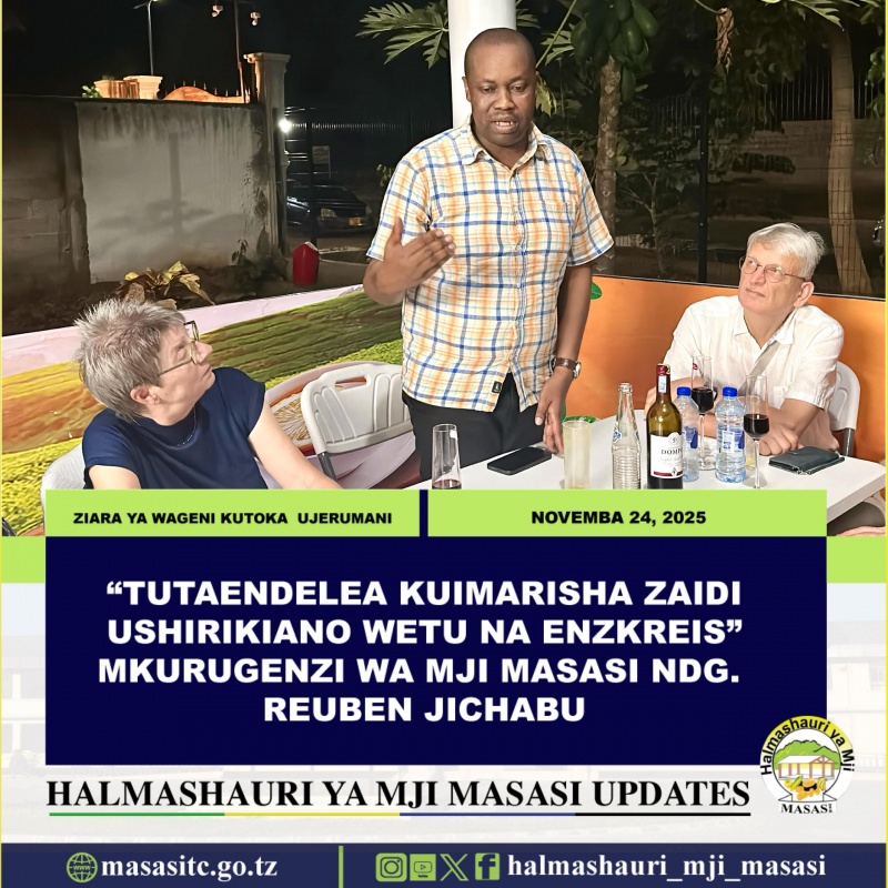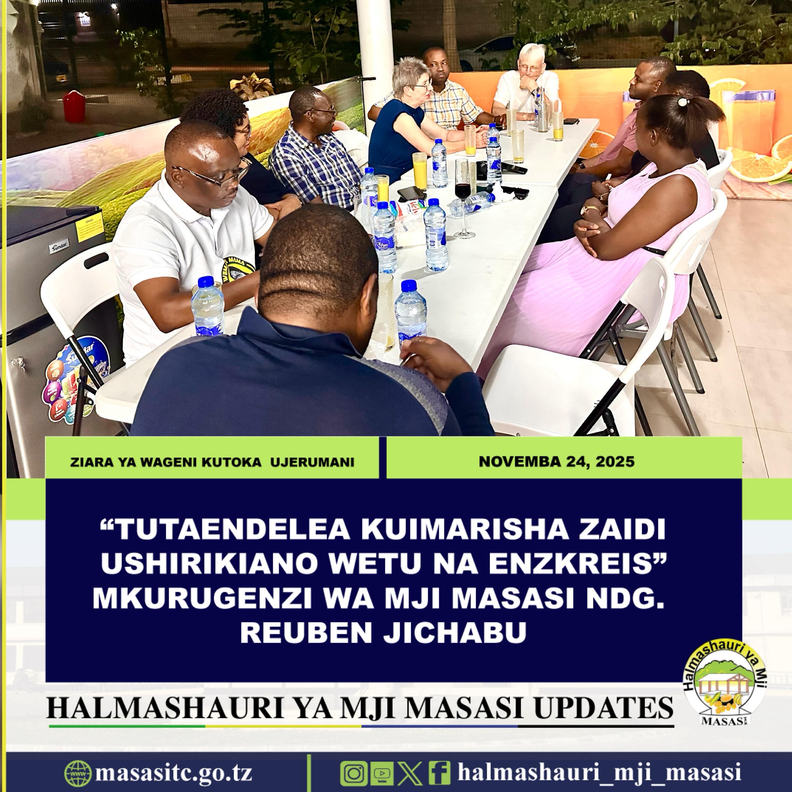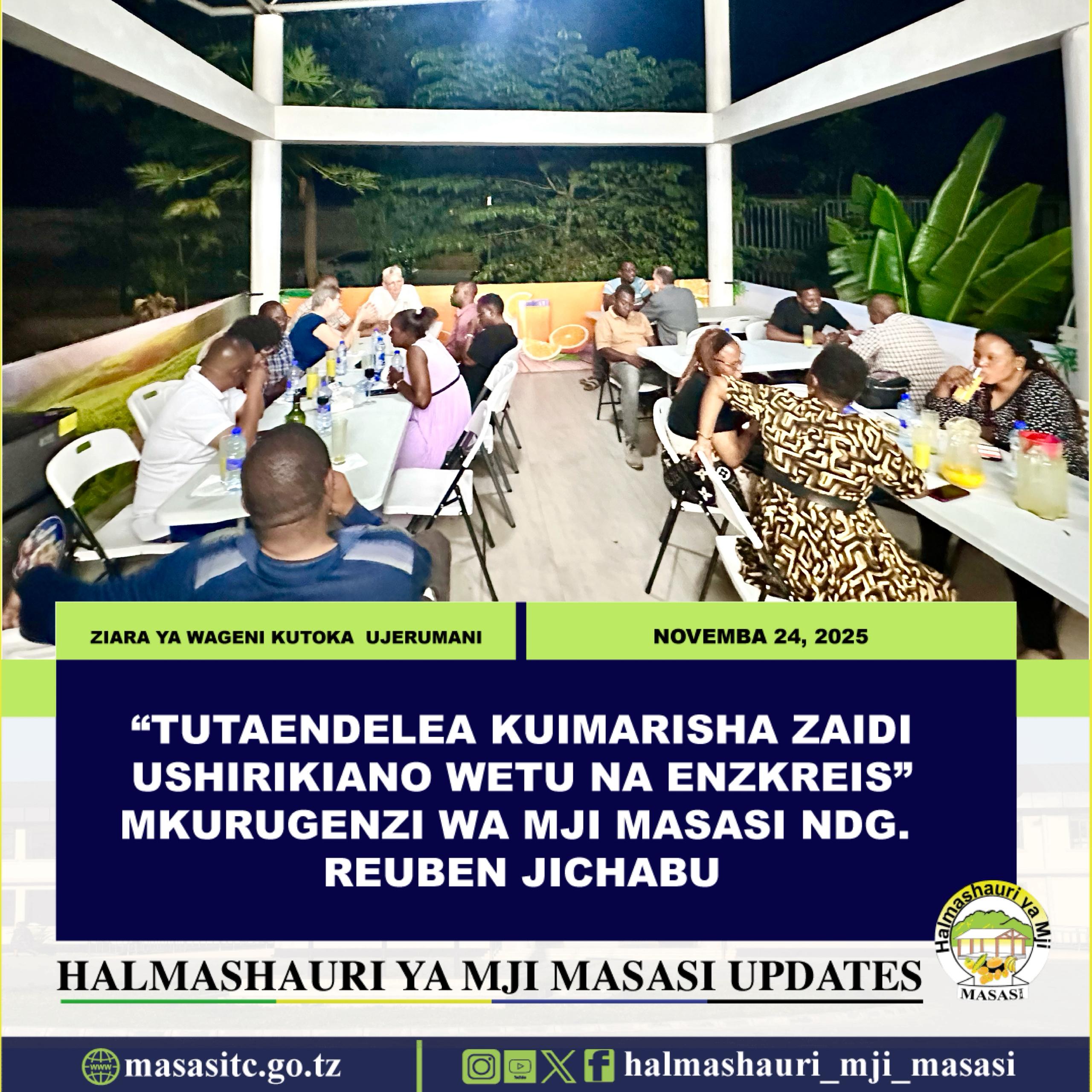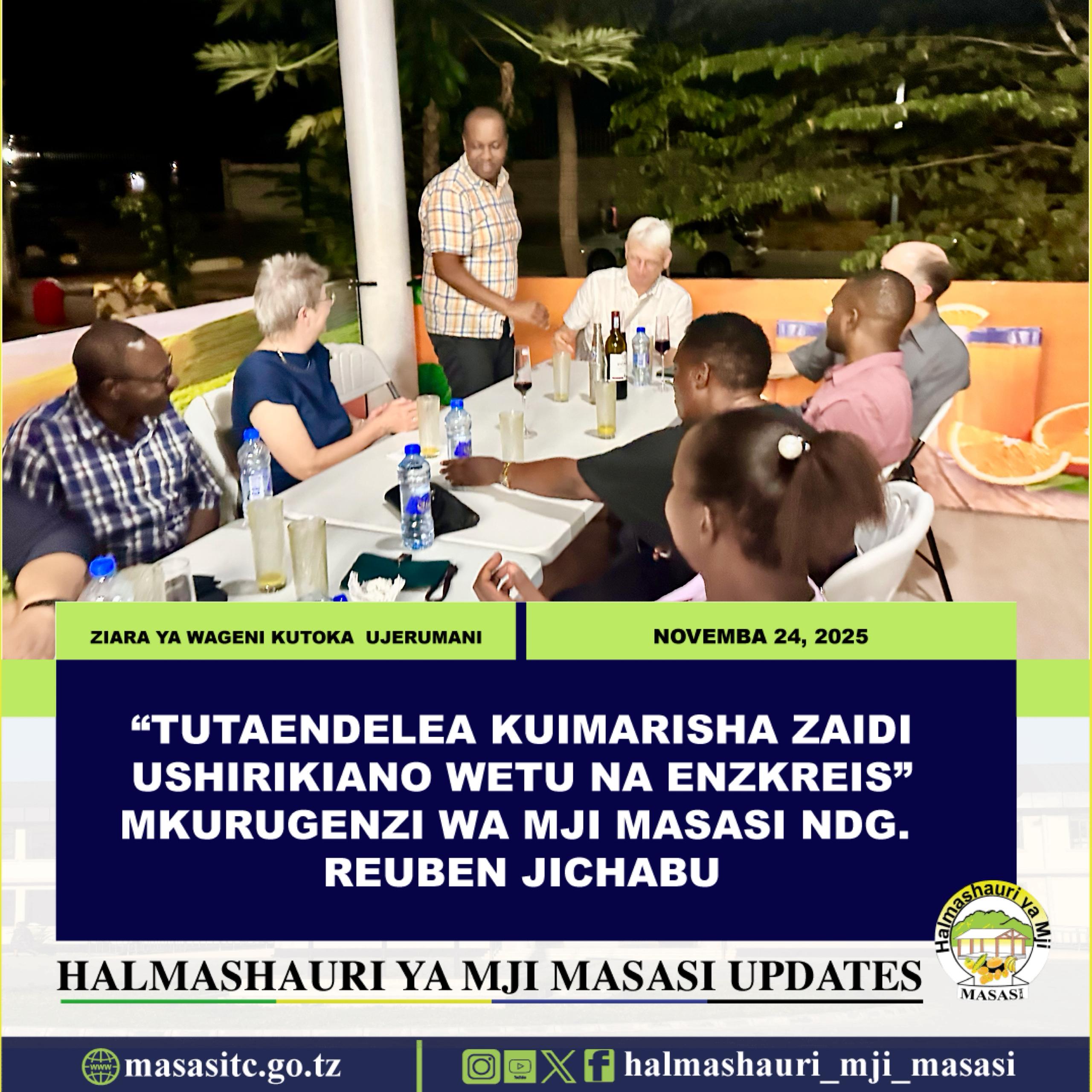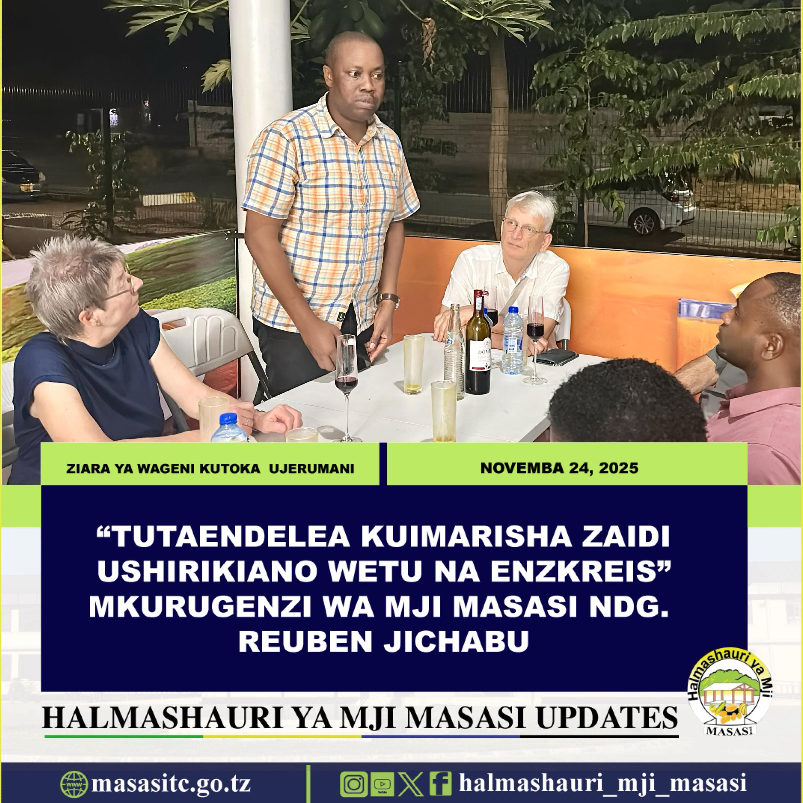 Mkurugenzi wa Halmashauri ya Mji Masasi Ndg. Reuben Sixbert Jichabu amesema ziara ya ugeni wa marafiki wa Masasi kutoka wilaya ya Enzkreis ya nchini Ujerumani ni ishara ya kuendelea kuimarisha uhusiano huo wa muda mrefu uliopo kati ya Masasi na Enzkreis katika nyanja mbalimbali ikiwemo Afya, Mazingira hususani kuongeza ushirikiano katika suala la udhibiti taka , elimu, ujuzi na kubadilishana uzoefu kwa ajili ya maendeleo endelevu ya Masasi.