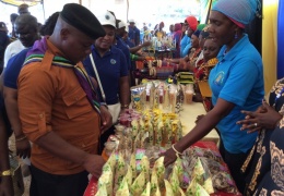 Kiongozi wa Mwenge wa Uhuru Kitaifa Ndugu Mzee Mkongea Ali akikagua bidhaa za Wajasiriamali.